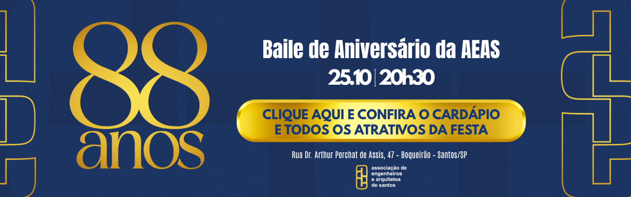 A Associação de Engenheiros e Arquitetos de Santos (AEAS) comemora seus 88 anos de história com uma grande celebração no próximo dia 25 de outubro de 2025, reunindo associados, amigos e convidados em uma noite especial na sede da entidade. A programação promete boa música, gastronomia refinada e momentos de integração que marcam a tradição da AEAS.