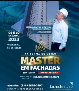 Vem aí o XX Curso Master em Fachadas, com o Engenheiro Civil e Projetista em Fachadas Leonardo Xavier de Oliveira, que acontece na sexta-feira, dia 9 de junho, das 17h30 às 22h, e no sábado, das 8h às 17h30, no Sindicato do Comércio Varejista da Baixada Santista, em Santos.
