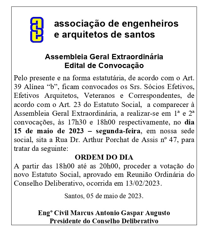 Será no dia 15 de maio (segunda-feira), a partir das 17h30, para proceder quanto a votação no novo Estatuto Social, aprovado em reunião ordinária do Conselho Deliberativo, ocorrida em 13 de fevereiro de 2023.